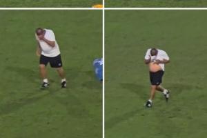 赛后危地马拉工作人员收拾足球时落泪。
