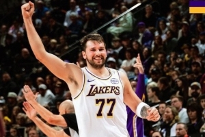 赛后湖人官方发布赢球海报,封面为东契奇举手庆祝瞬间。